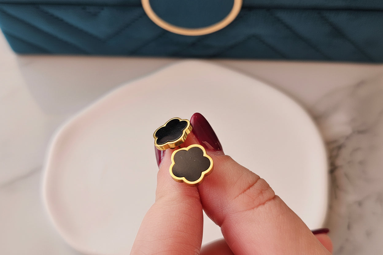 A BLOOM fülbevaló aranyszínű, fekete virág alakú bedugós fülbevaló visszafogott, mégis karakteres megjelenést biztosít.