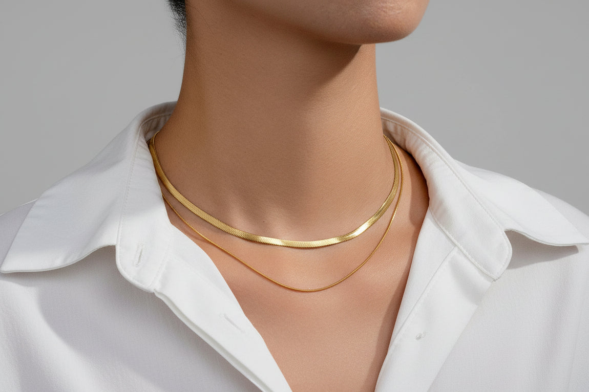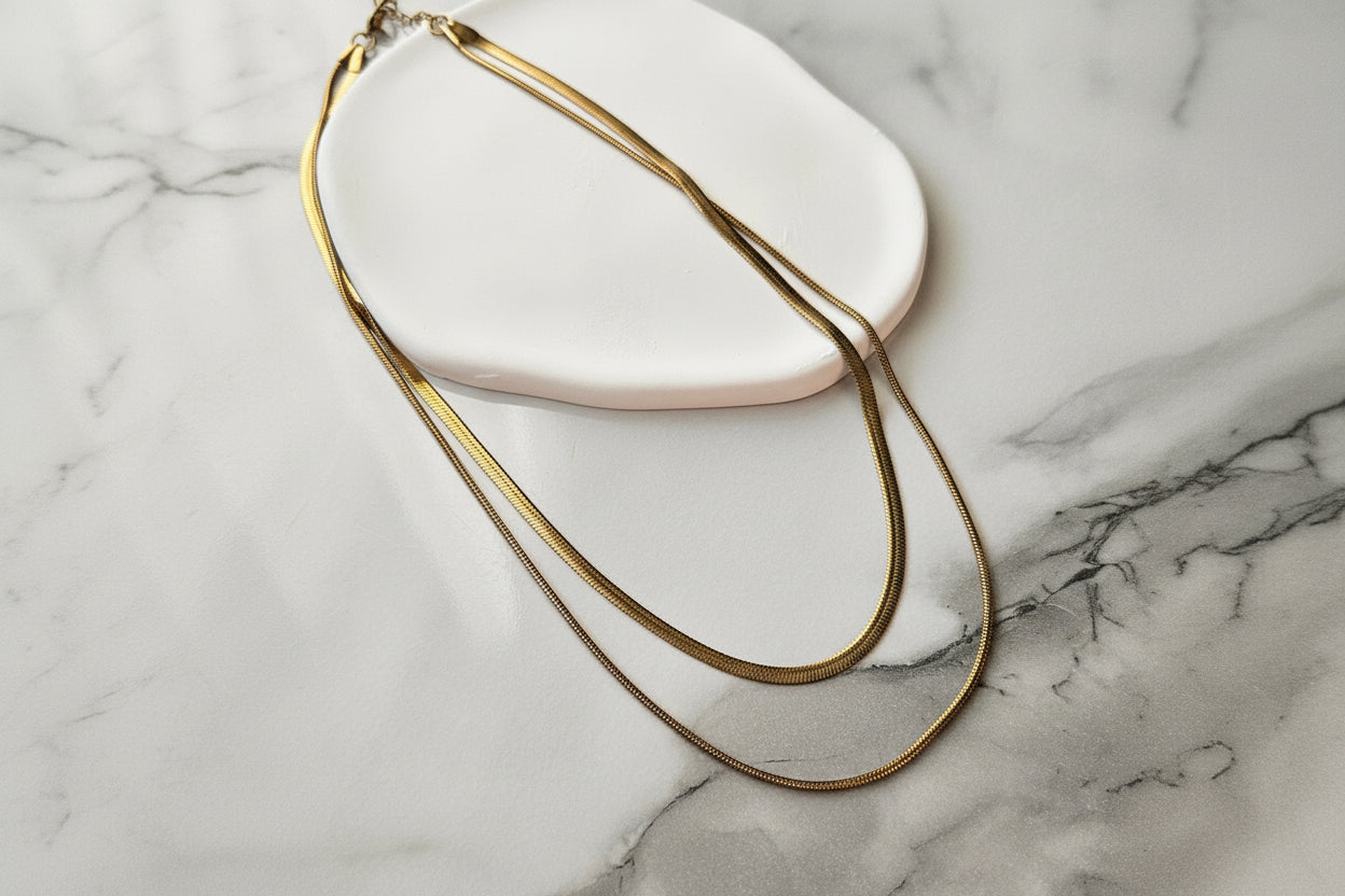A CELINE nyaklánc egy aranyszínű, kétsoros nyaklánc, ami a kontrasztokra épít: a lapos, széles lánc modern karaktert ad, míg a vékony lánc finom egyensúlyt teremt.