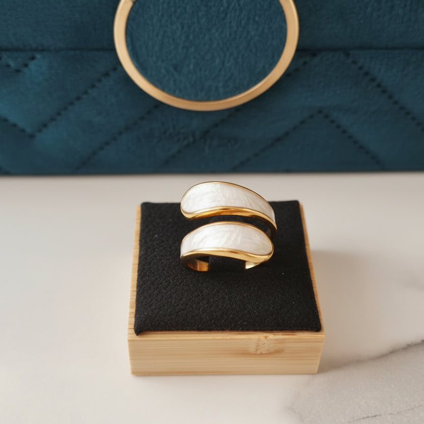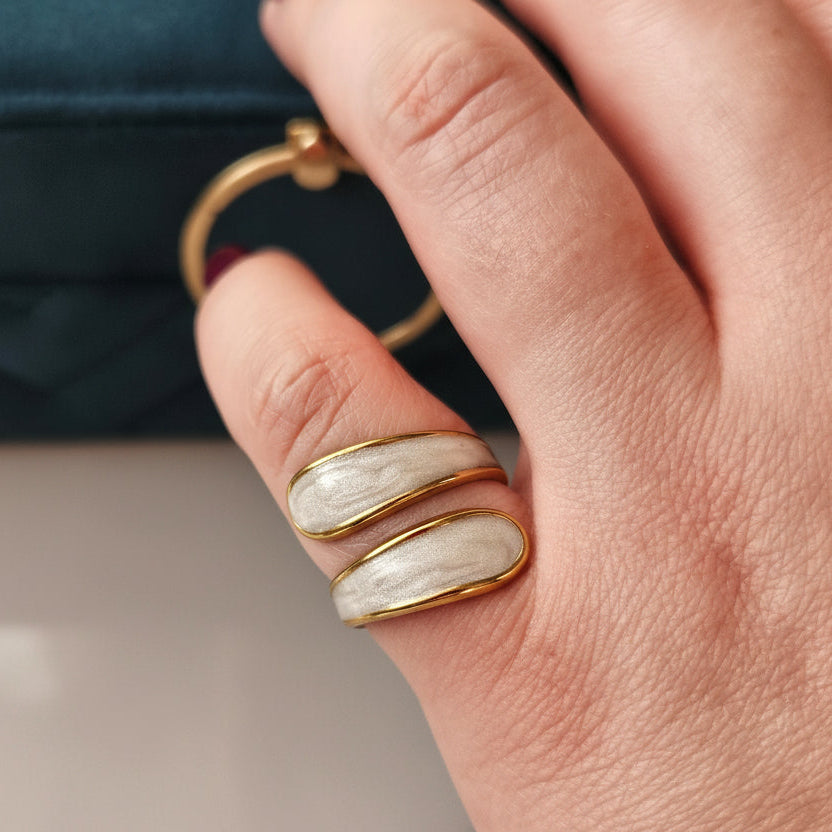 A MARBELLA gyűrű egy aranyszínű gyűrű, ami a fehér márványos berakással és az egymásba futó két szállal letisztult, mégis különleges hatást kelt.