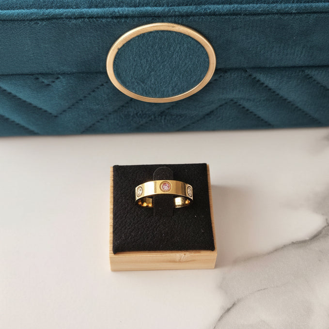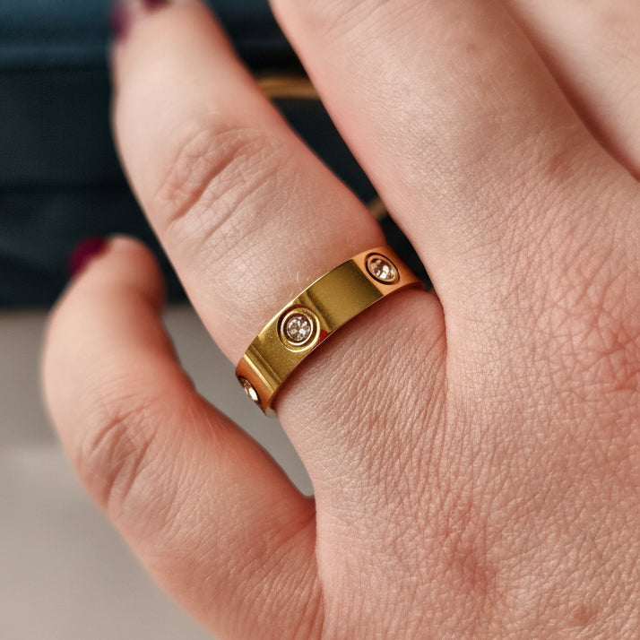 A RONI gyűrű egy aranyszínű gyűrű, ami a körben elhelyezett néhány zirkonia kővel finom, visszafogott csillogást ad a megjelenésedhez.
